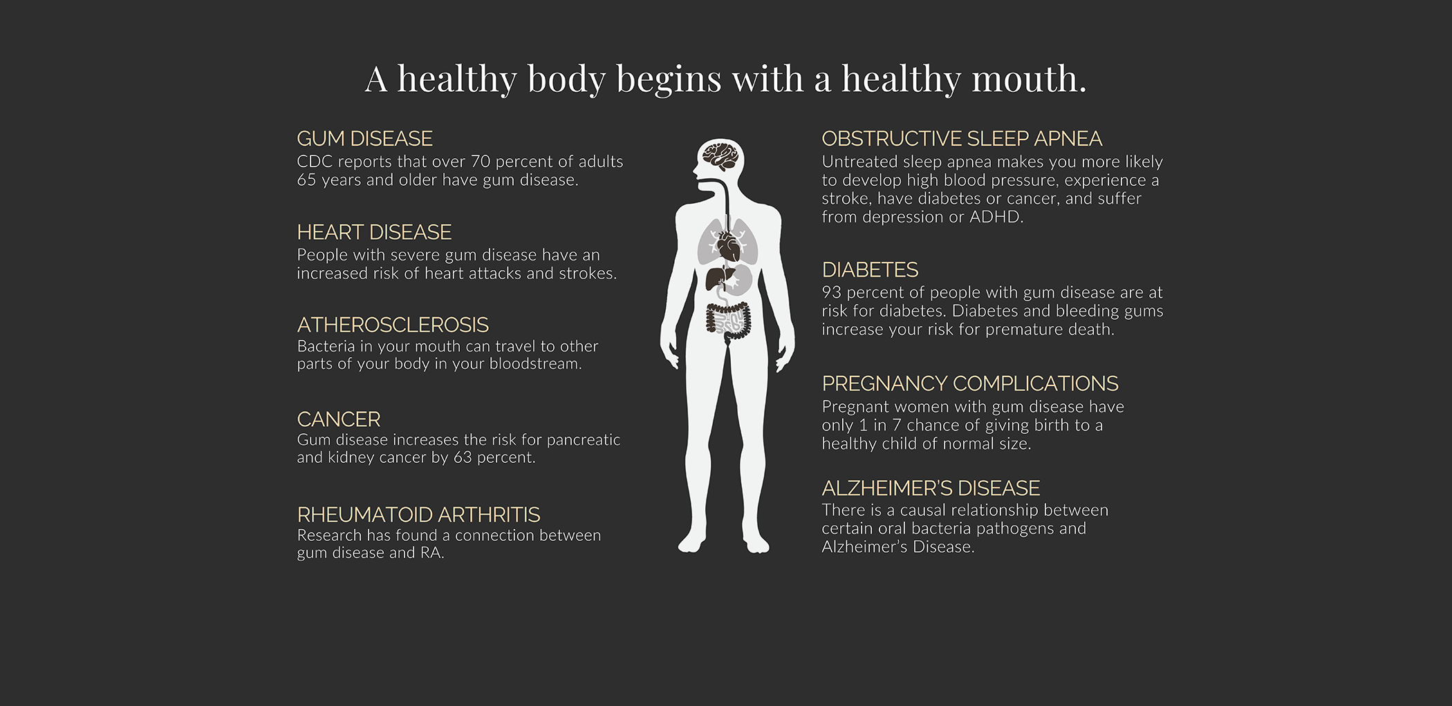 The CDC reports that over 70% of adults 65 years and older have gum disease. Gum disease has been connected to an increased risk of several medical conditions. Keep scrolling to learn more.